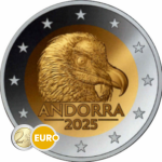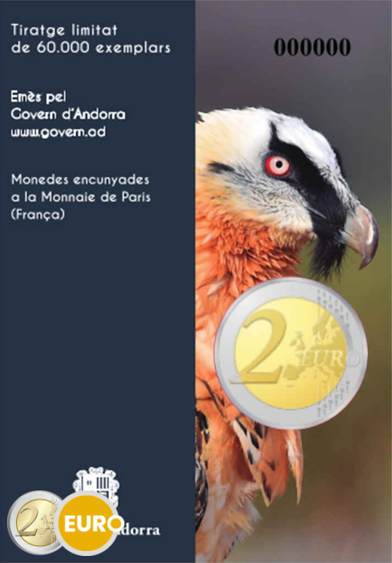 This coin is dedicated to the bearded vulture (Gypaetus barbatus), one of the most emblematic birds of the Andorran Pyrenees. Recognizable by its dense plumage and hooked beak, this vulture species is currently on the list of endangered species. With this issuance, Andorra wants to emphasize the importance of protecting and preserving its species.