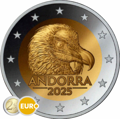 The coin features a detailed portrait of the bearded vulture’s head, looking to the right. The plain background emphasizes its imposing expression. Below the image are the name of the country, “ANDORRA”, and the year “2025”, all framed by the silver ring with the twelve stars of the European Union.