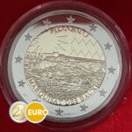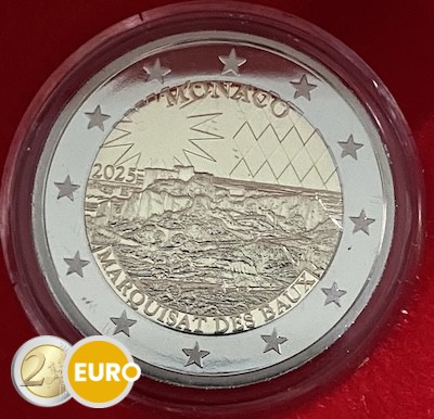 On the obverse is depicted in the center the famous rock of Les Baux-de-Provence (Bouches-du-Rhône) in its present state, together with the surroundings of the village of Les Baux-de-Provence. At the top of the coin appears the issuing country “MONACO”, accompanied on the right by a checkered shield and on the left by the star symbolizing Les Baux. At the bottom are the inscription “MARQUISAT DES BAUX”, the year of issue “2025”, as well as the mintmarks of the Monnaie de Paris and the general engraver Joaquin Jimenez. On the outer ring of the coin are the twelve stars of the European flag.