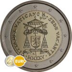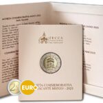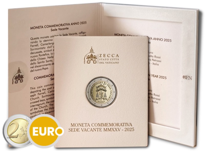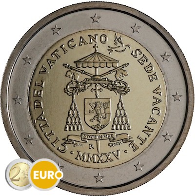Coat of arms of the Camerlengo, Cardinal Kevin Farrell, beneath the symbol of the Apostolic Chamber, represented by two crossed keys beneath a basilica canopy. On the left edge appears the issuing country “CITTÀ DEL VATICANO”, on the right edge the occasion of issue “SEDE VACANTE”, and at the bottom the Roman year “MMXXV”. In the upper right of the design, a dove carrying an olive branch interrupts the circular inscription. The mintmark “R” of the Rome Mint is placed beneath the coat of arms of the Camerlengo, accompanied by the engraver’s name on the left and the initials of the designer “O. ROSSI” on the right.